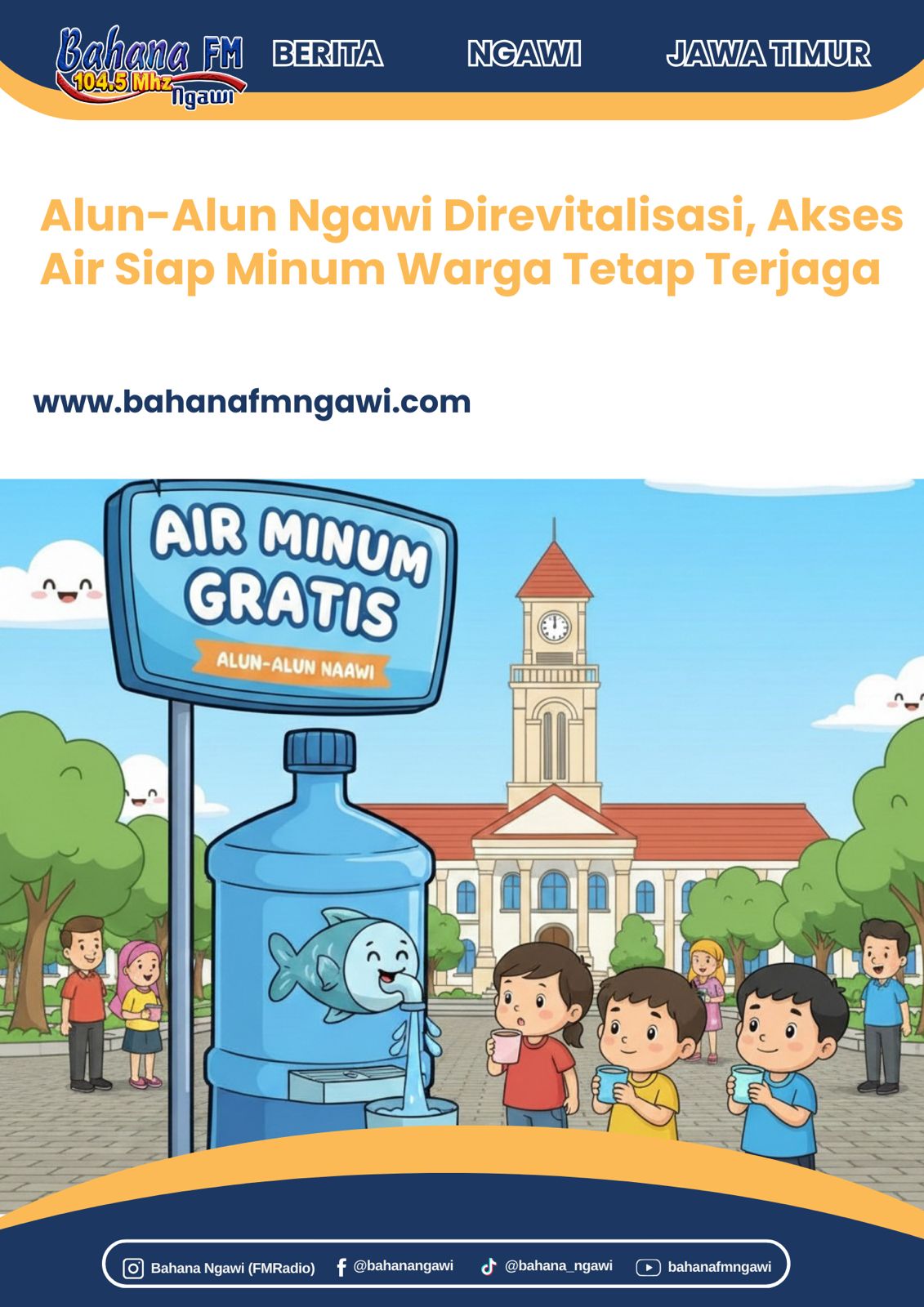 Bahanafmngawi.com – Fasilitas air siap minum di kawasan Alun-Alun Ngawi dipastikan tetap hadir untuk masyarakat, meski lokasinya akan dipindahkan sementara. Dinas Perumahan Rakyat dan Kawasan Permukiman (DPRKP) Kabupaten Ngawi mengambil langkah tersebut seiring rencana revitalisasi Alun-Alun Ngawi yang mulai dilaksanakan tahun ini.