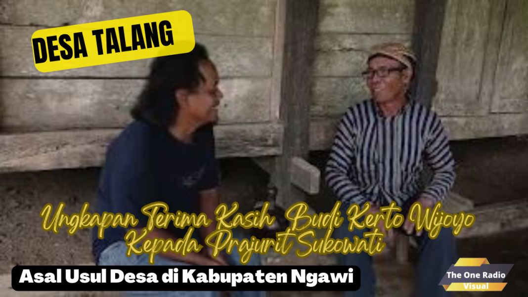 Sejarah Desa Ngawi – Asal Usul Desa Talang Ngawi Mbah kerto wijoyo nek kulo ngaturi mbah ning, nek mestine ora mbah, nek jaman semono jik timur, pak opo ki opo nopo, mestine ijek timur. Namine Kerto Wijoyo mergo niku prajurit soko sukowati, kerto niku tegese tentrem, wijoyo niku digdoyo, dadi niku gandeng wonten mriko perkarane nopo teng sukowati kulo nggih mboten ngerti, wong jarene ngakune prajurit, badhe suwito golek gawean teng mbah surodrono demang ngrayudan sing mpun kepinten niku. Jaman sementen demange mpun dangu kok, lha niku nek kowe nyambut gawe neng kene, tak tompo ning gaweanmu kowe jogoo gerbang masuke wong-wong sing arep sejolo ning lor kono,. Lor kono niku ngisor kono, dereng enten ukoro talang, ning ngisor kono ae, neng lor kono, ngoten thok… dereng enten ukoro talang. sareng ngoten digladi saestu, gawe opo-opo teng mriko nopo-nopo diparingke, gampangane yo diuji digladi lah. kowe nyekelo maling, nyekel iki, nyekel iki, nyatane saget ngrampungi lan berhasil kanti apik, lan bareng ketok gaweane apik, lan terus dihadiahi, yowes nek kowe apik,matur nuwun ya, aku wes mbok talangi, urong nganti tekan kene kok wes rampung, wes ayem wes tentrem ora ono opo-opo, mulane kowe tak hadiahi, tak hadiahi.. yo deso eneng lor kuwi, kowe ngadeko bekel neng kono, bekel niku lurah nek coro sakniki, ngadeke bekel ning deso lor kuwi, aa bekel kuwi tak jenengke Deso Talang.