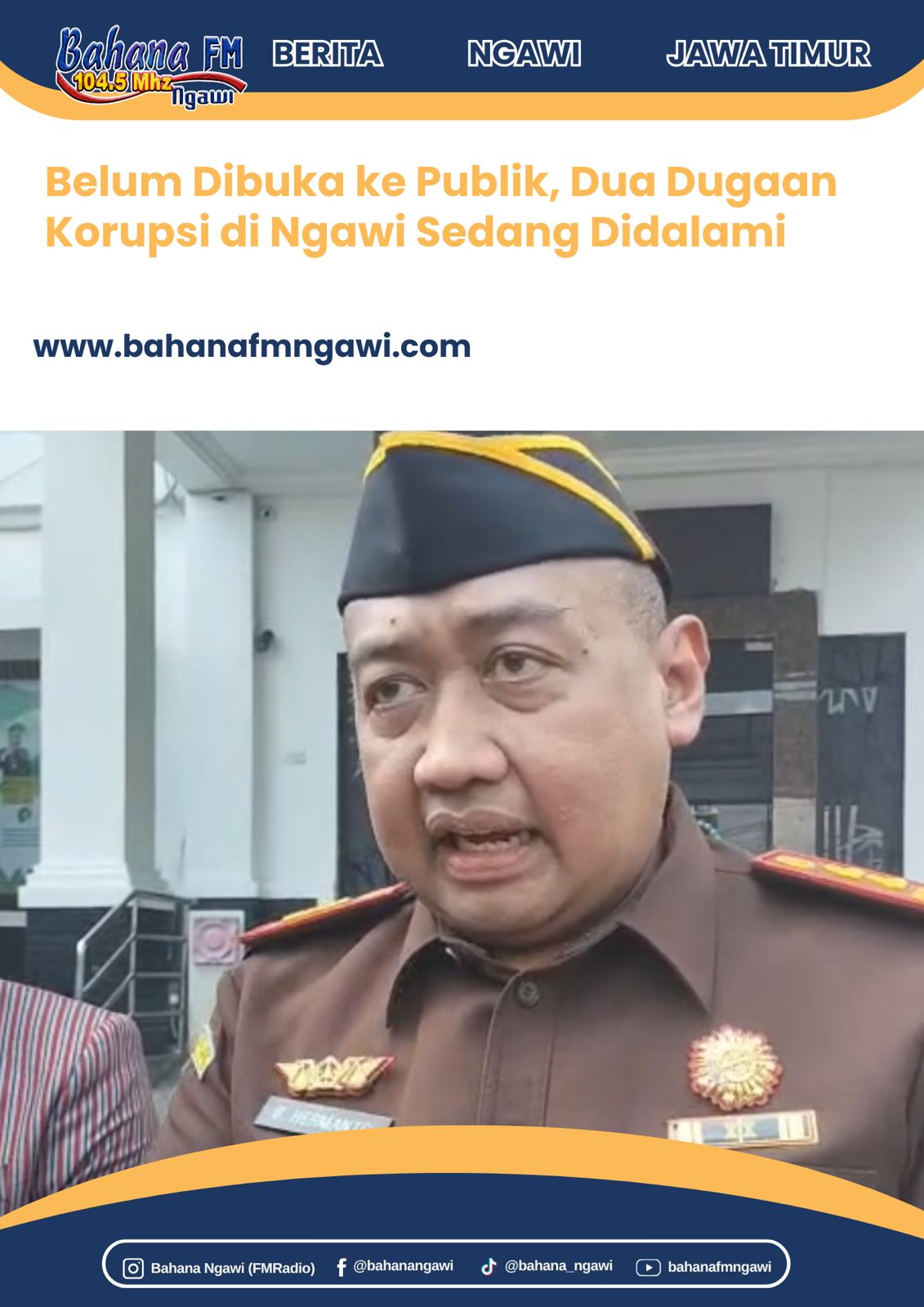 Bahanafmngawi.com – Dua dugaan kasus korupsi kini tengah dibidik Kejaksaan Negeri Ngawi. Meski belum dibuka ke publik, proses hukum dipastikan terus bergulir di tahap awal penyelidikan.