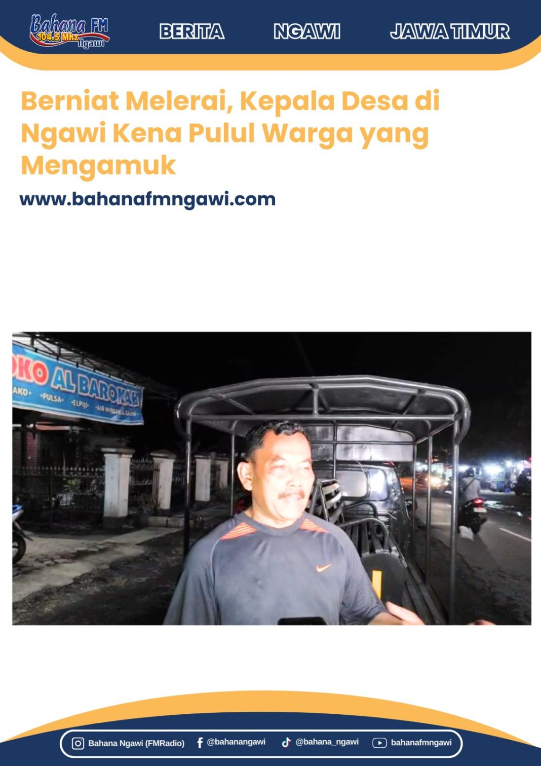 Bahanafmngawi.com – Warga Desa Waruk Tengah, Kecamatan Pangkur, Kabupaten Ngawi, digegerkan aksi seorang pria bernama Slamet (35) yang mendadak mengamuk pada Senin sore (13/10/2025). Dalam kondisi emosi, Slamet menyerang sejumlah warga bahkan memukul Kepala Desa Waruk Tengah, Supono, yang berusaha menenangkannya.