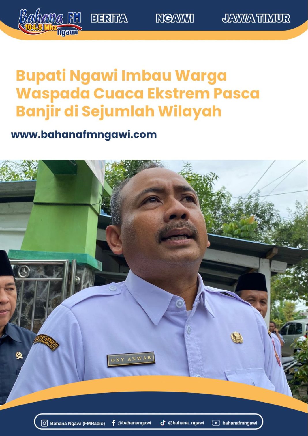 Bahanafmngawi.com – Banjir yang melanda beberapa wilayah di Kabupaten Ngawi mendapat perhatian serius dari pemerintah daerah. Bupati Ngawi, Ony Anwar Harsono, menyebut intensitas hujan yang tinggi dan berlangsung lama menjadi pemicu utama meningkatnya debit air sungai hingga meluap ke permukiman.