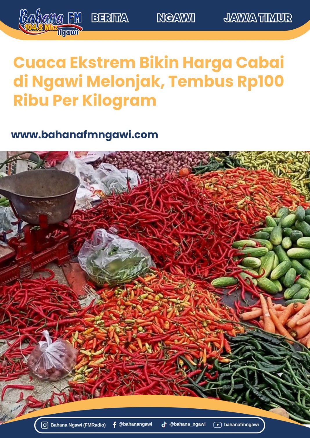 Bahanafmngawi.com – Harga cabai rawit di sejumlah pasar tradisional di Kabupaten Ngawi meroket tajam dalam beberapa hari terakhir. Dari sebelumnya berkisar Rp40.000–Rp50.000 per kilogram, kini tembus hingga Rp100.000 per kilogram. Lonjakan ini terjadi akibat pasokan cabai yang semakin menipis di tengah cuaca ekstrem yang melanda wilayah pemasok.