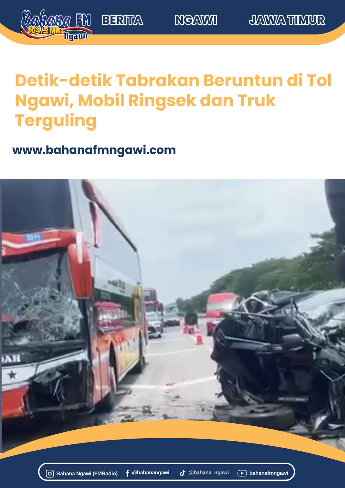 Detik-detik pascakejadian terekam dalam video yang beredar di media sosial. Terlihat sebuah mobil hitam mengalami kerusakan paling parah dengan bagian depan nyaris hancur. Tak jauh dari kendaraan tersebut, sebuah truk terguling ke sisi kiri dan berhenti berdekatan dengan alat berat. Dua bus yang terlibat juga tak luput dari kerusakan, satu bus ringsek di bagian depan kiri dengan kaca pecah berserakan, sementara bus lainnya mengalami benturan di bagian belakang.