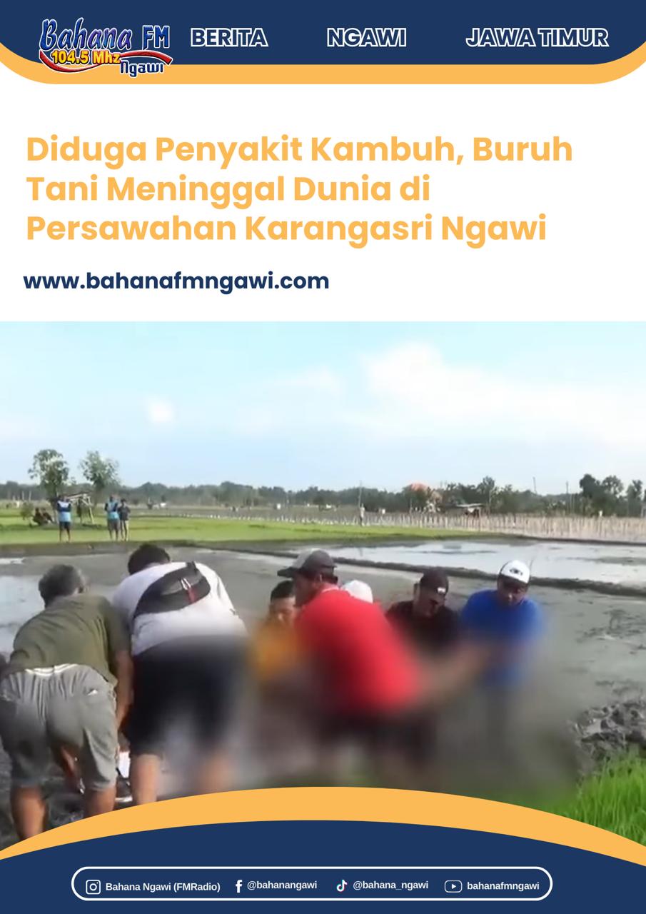Bahanafmngawi.com – Suasana Dusun Nglarangan, Desa Karangasri, Kecamatan Ngawi, mendadak gempar setelah warga menemukan sesosok pria lanjut usia meninggal dunia di area persawahan, Rabu sore. Korban ditemukan tergeletak tak bernyawa di tengah sawah saat aktivitas warga masih berlangsung.