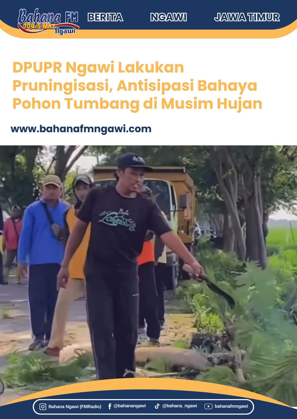 Bahanafmngawi.com – Dinas Pekerjaan Umum dan Penataan Ruang (DPUPR) Kabupaten Ngawi kembali menunjukkan langkah nyata dalam menjaga keselamatan pengguna jalan. Menyongsong musim penghujan, DPUPR bersama sejumlah instansi terkait melaksanakan kegiatan pruningisasi atau pemangkasan pohon di sepanjang ruas Jalan Kedungglagah–Kendung.