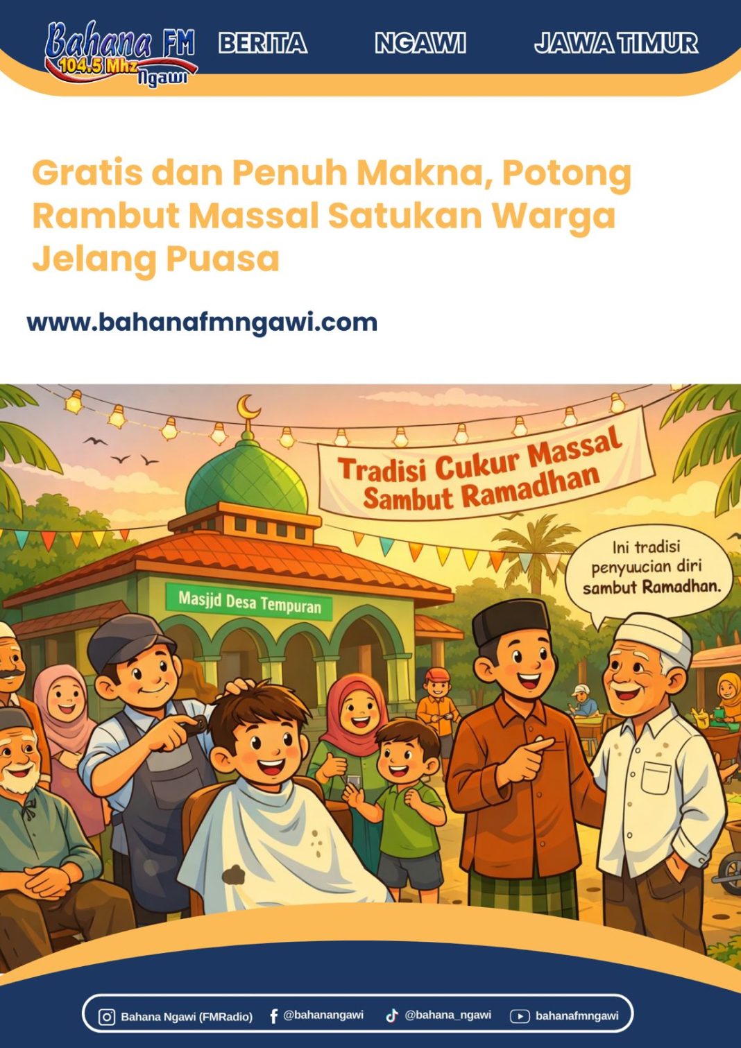 Bahanafmngawi.com – Menjelang datangnya bulan suci Ramadhan, suasana hangat terlihat di halaman masjid Desa Tempuran, Kecamatan Paron, Kabupaten Ngawi. Sejumlah warga dari berbagai usia berkumpul mengikuti tradisi potong rambut massal yang rutin digelar setiap tahun.