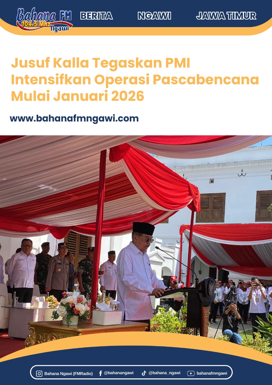 Pernyataan tersebut disampaikan Jusuf Kalla saat memimpin Apel Hari Relawan PMI sekaligus melantik pengurus PMI Provinsi Jawa Timur masa bakti 2025–2030 di Benteng Van Den Bosch, Kabupaten Ngawi, Selasa (17/12/2025).