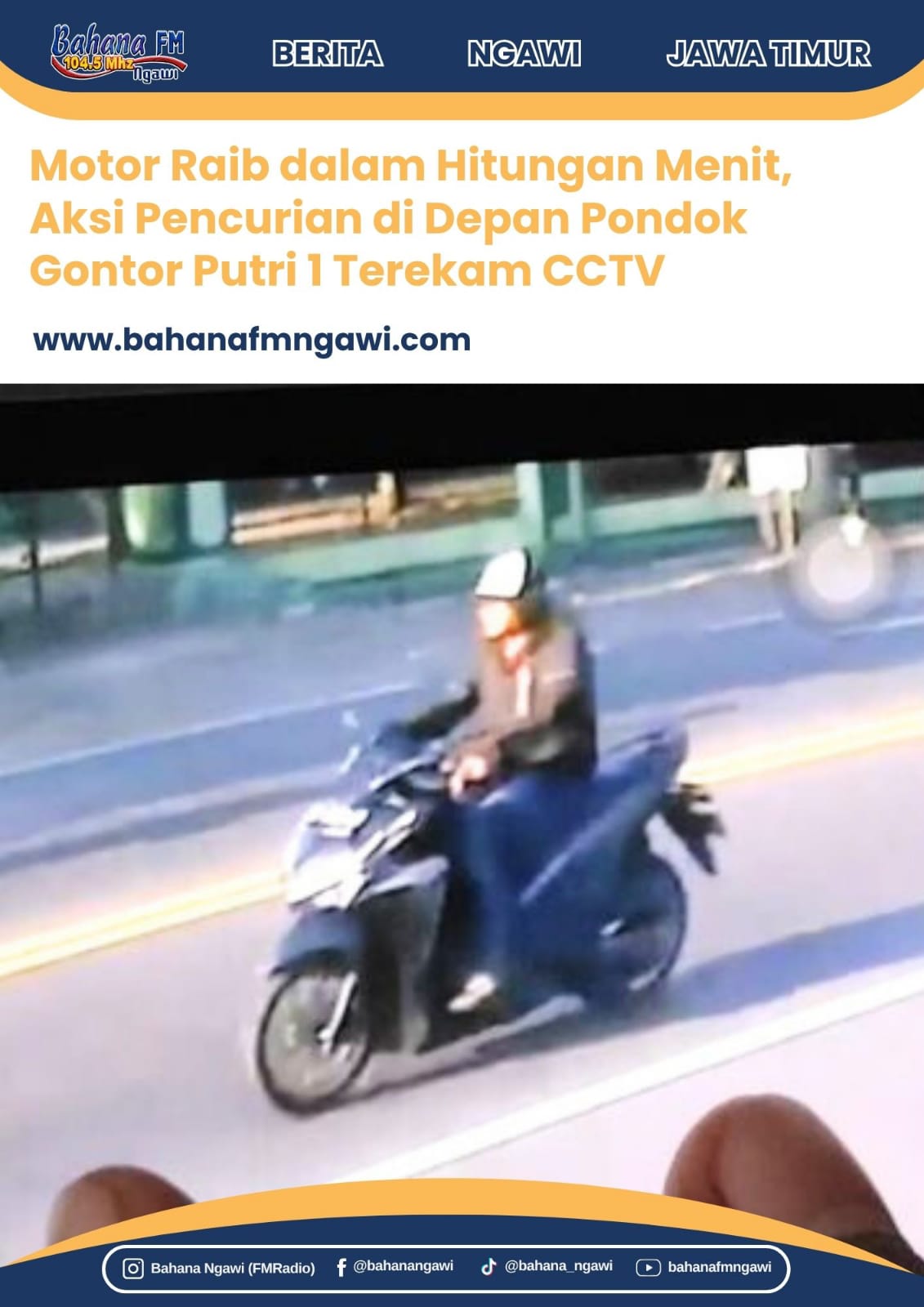 Bahanafmngawi.com – Aksi pencurian sepeda motor terjadi di depan sebuah ruko yang berlokasi di sekitar Pondok Gontor Putri 1, Kabupaten Ngawi. Dalam kejadian yang berlangsung cepat itu, satu unit Honda Vario 150 warna hitam milik Sutini (53), warga Desa Sambirejo, Kecamatan Mantingan, raib digondol maling pada Senin pagi (13/10/2025).