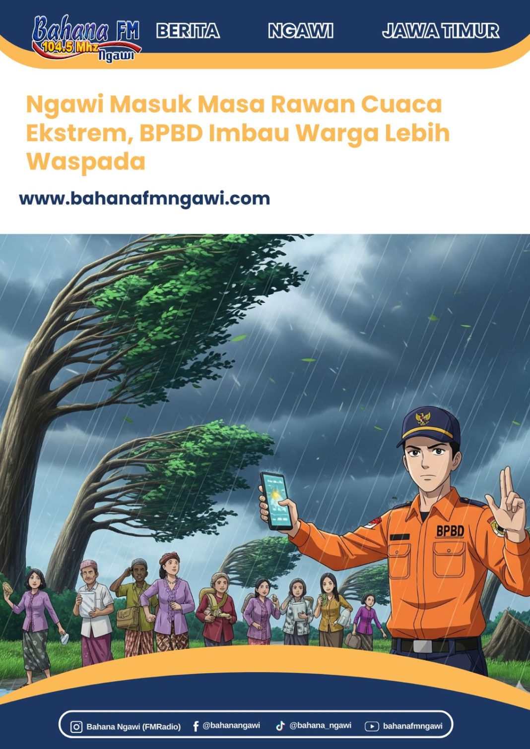 Badan Penanggulangan Bencana Daerah (BPBD) Ngawi mengingatkan warga untuk lebih berhati-hati, terutama di wilayah yang selama ini kerap terdampak cuaca ekstrem. Beberapa kecamatan seperti Ngawi, Geneng, dan Paron disebut menjadi daerah yang cukup rawan terhadap kejadian angin kencang.