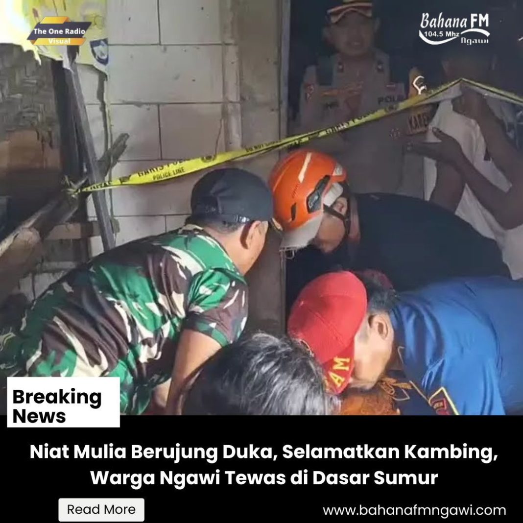 Bahanafmngawi.com – Upaya menyelamatkan anak kambing berakhir tragis bagi Sumarno (61), warga Desa Kedungputri, Paron, Ngawi. Ia ditemukan tewas di dasar sumur sedalam 25 meter di belakang rumahnya, setelah diduga terpeleset saat mencoba menolong hewan peliharaannya yang tercebur.