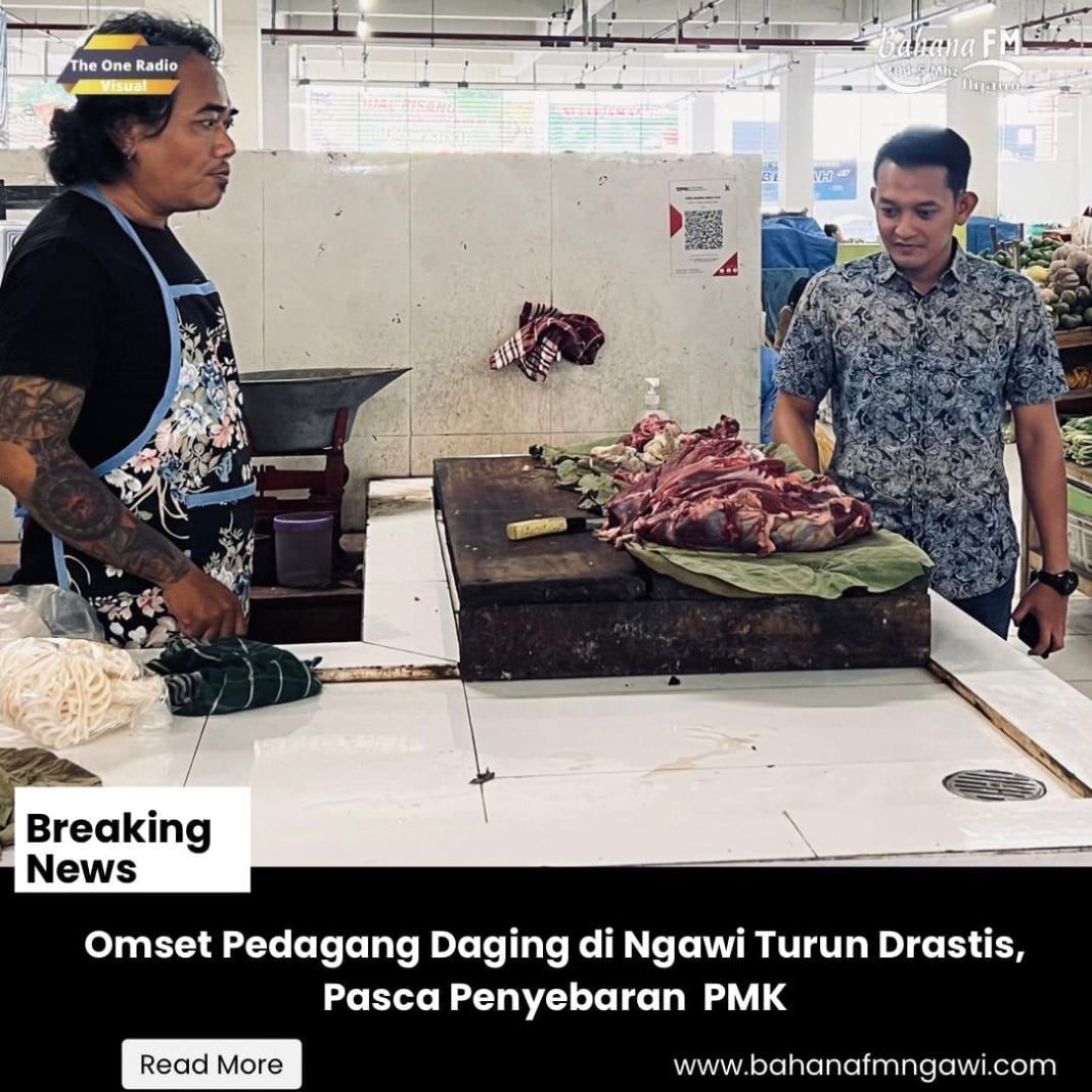 Dampak wabah penyakit mulut dan kuku (PMK) yang menyerang ratusan sapi terhadap omset penjualan pedagang daging sapi di sejumlah pasar di Kabupaten Ngawi menurun, seperti yang terjadi di Pasar Besar Ngawi.