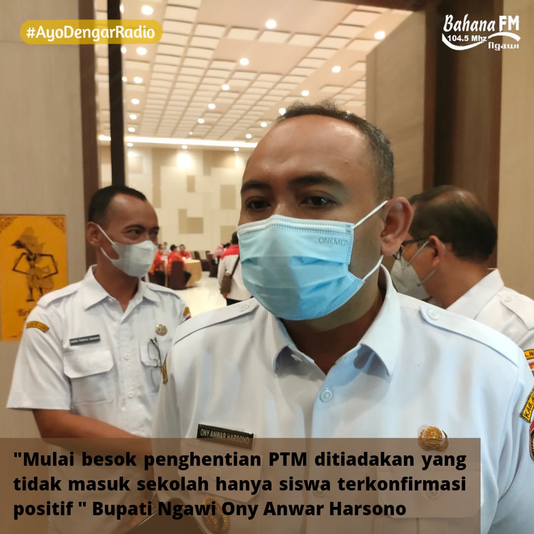 BAHANAFM,NGAWI– Bupati Ngawi Ony Anwar Harsono mengungkapkan mulai besok, Kamis(03/02/2022) penghentian pelaksanaan pembelajaran tatap muka (PTM) akan ditiadakan.  Siswa yang tidak boleh masuk sekolah diberlakukan kepada mereka yang terindikasi positif Covid-19. Sehingga berdasarkan kesepakatan dengan pimpinan daerah besok lembaga sekolah yang terlanjur during imbas penyebaran Omicron akan masuk kembali.