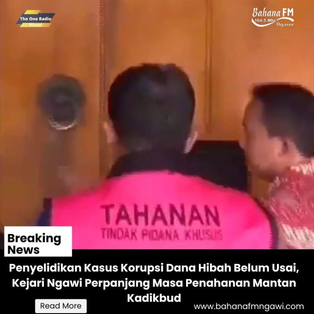 Kejaksaan Negeri Ngawi memperpanjang masa penahanan tersangka kasus korupsi dana hibah pada Dinas Pendidikan dan Kebudayaan tahun 2022, perpanjangan penahanan ini mengingat proses penyedikan masih terus berlangsung.