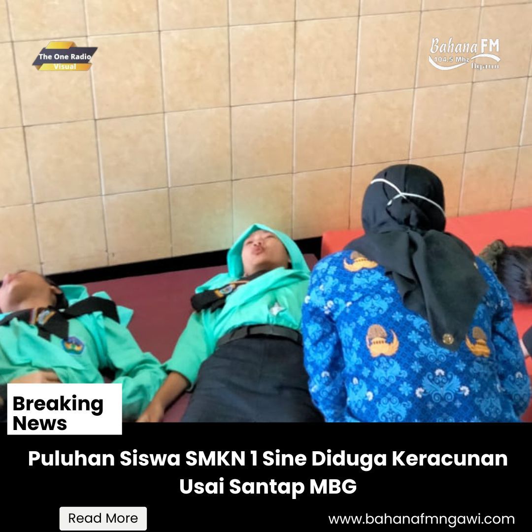 Bahanafmngawi.com – Puluhan siswa SMKN 1 Sine, Kabupaten Ngawi, Jawa Timur, diduga mengalami keracunan massal usai mengonsumsi makanan program Makan Bergizi Gratis (MBG). Hingga Rabu (1/10/2025) siang, tercatat 50 siswa menjalani perawatan di Puskesmas Sine dengan keluhan serupa.