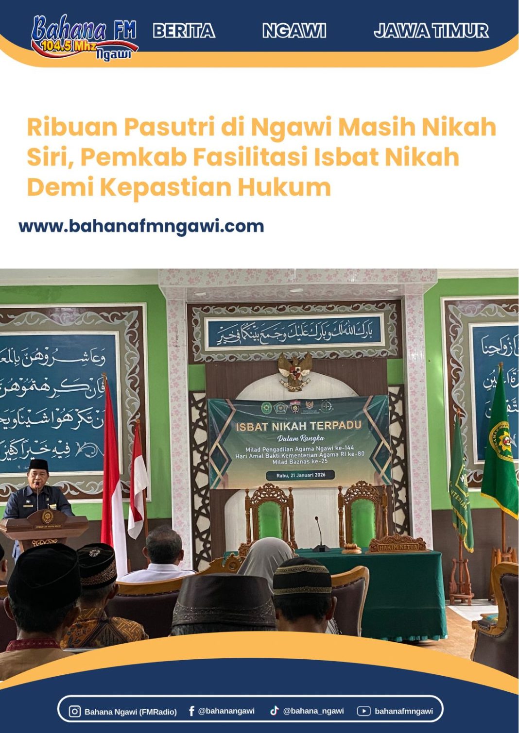 “Masih ada ribuan pasangan di Ngawi yang pernikahannya belum tercatat secara resmi. Ini menjadi perhatian bersama karena menyangkut perlindungan hukum dan masa depan keluarga,” ujar Ony Anwar Harsono (21/01/2026)