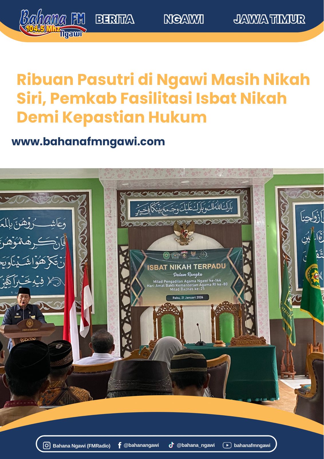 Ketua Pengadilan Agama Ngawi, A. Mahfudin, menegaskan masih banyak pasangan yang belum memiliki buku nikah dan mendorong kesadaran masyarakat untuk segera melaporkan status pernikahannya.