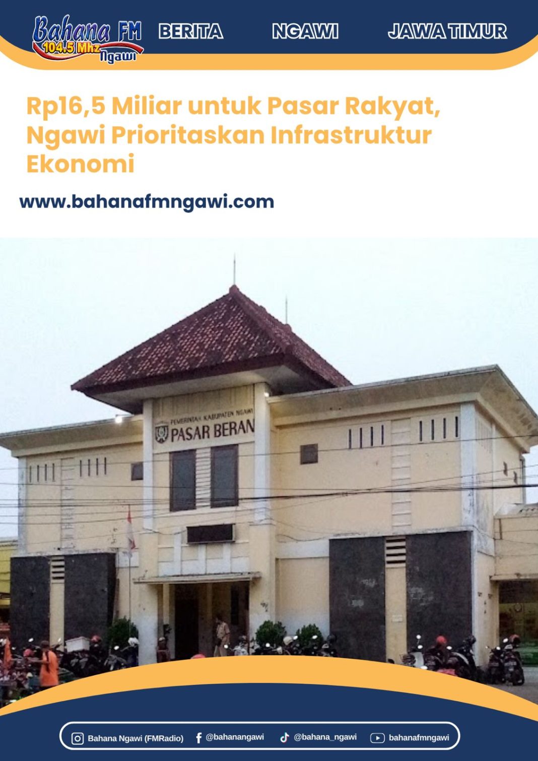Bahanafmngawi.com – Pemerintah Kabupaten Ngawi menegaskan komitmennya dalam memperkuat sektor ekonomi kerakyatan melalui rehabilitasi Pasar Beran dan penataan kawasan pasar hewan yang masuk dalam daftar proyek strategis daerah tahun ini. Kedua proyek tersebut digelontor anggaran total Rp16,5 miliar yang bersumber dari bantuan keuangan Provinsi Jawa Timur serta APBD Kabupaten Ngawi.