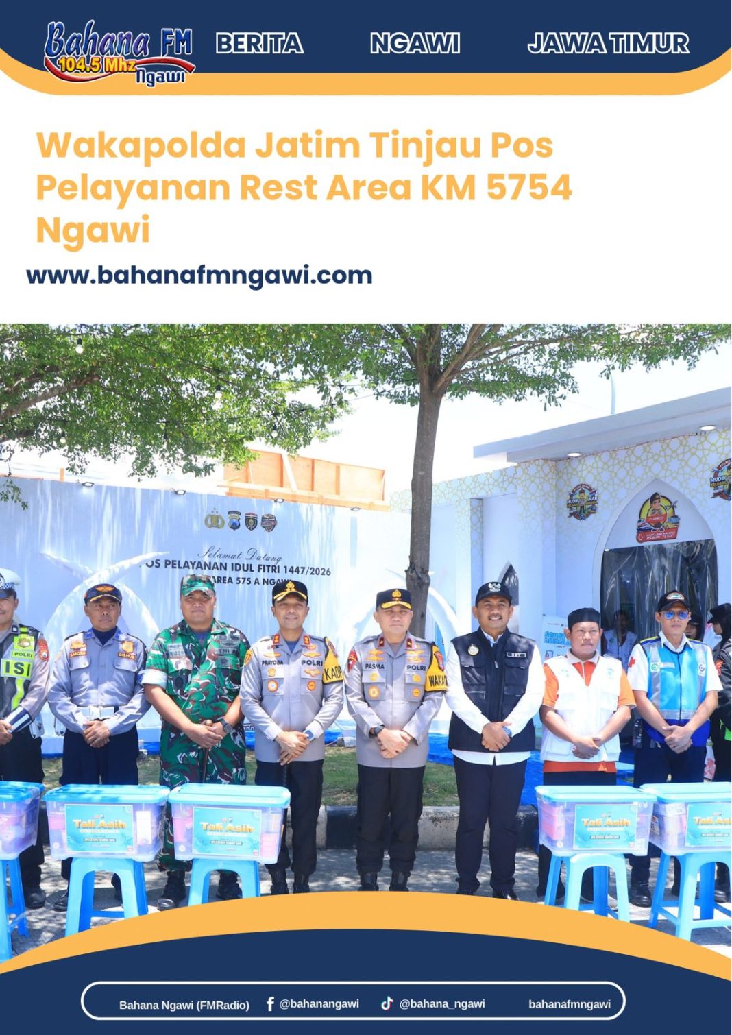 Bahanafmngawi.com – Wakil Kepala Kepolisian Daerah Jawa Timur Brigjen Pol Dr. Pasma Royce, S.I.K., M.H., bersama rombongan melaksanakan kunjungan kerja ke Pos Pelayanan (Pos Yan) di Rest Area KM 575A, guna mengecek kesiapan personel serta sarana dan prasarana dalam rangka pengamanan arus mudik dan balik Lebaran 1447 H, pada Rabu (18/3/2026)
